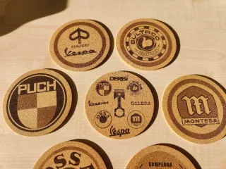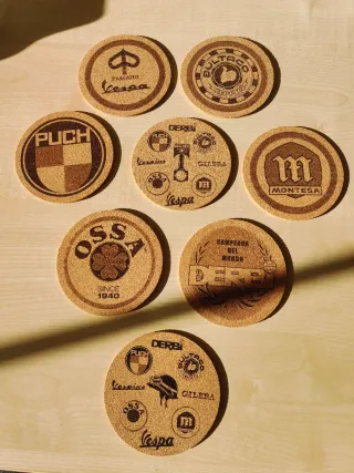 Posavasos de corcho con diseños grabados a láser con marcas de motos clásicas españolas - Material: Corcho natural. - Técnica: Grabado láser. - Diseños variados de marcas de motocicletas y scooters. - Diámetro aproximado: 9 cm. - Vespa, Vespino, Bultaco, Puch, Montesa, Pistón, Ossa, Derbi Engranaje, Gilera... Precio unitario. Se pueden preparar lotes.