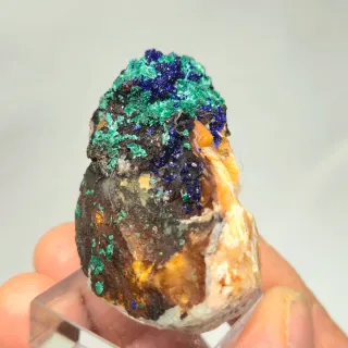 El ejemplar consta de magníficos cristales de azurita y malaquita, ambos con un color muy intenso y brillante. Procedente de Marruecos. 60,7 g 5,4 x 4,1 x 2,4 cm Más minerales en mi perfil