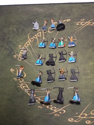 Conjunto de miniaturas de la Última Alianza, representando a guerreros elfos con arcos y espadas. Solo hay 4 rotas (arriba) El resto están bien, algunas sin base