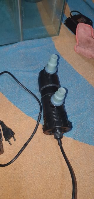 Lámpara UV de la marca JEBO, modelo UV-H9, diseñada para acuarios. Incluye su transformador. - Cuerpo negro. - Conexiones para manguera.