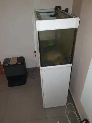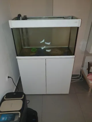 Acuario de 120 litros con su mueble blanco a juego. El mueble se regala con el acuario. - Capacidad: 120 litros. Medidas 80cm de ancho por 50 cm de alto y profundidad 35 cm - Mueble de color blanco.
