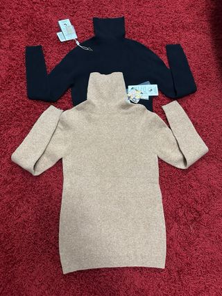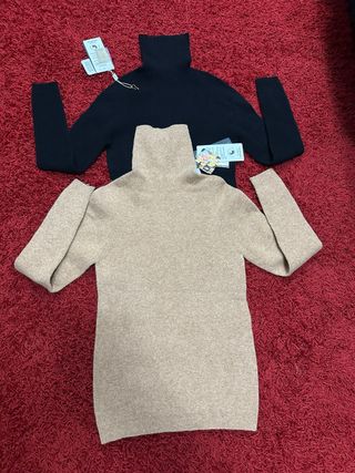 Dos jerseys de cuello alto para mujer, uno en color negro y otro en color camel. - Jersey negro de cuello alto. - Jersey camel de cuello alto. Talla S
