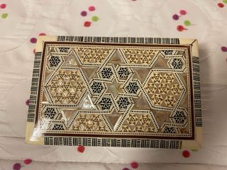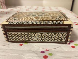 Elegante caja joyero hecha a mano con detalles en nácar y madera. - Diseño artesanal único. - Acabados intrincados en la tapa y los laterales.