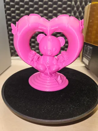 Figura decorativa de un oso de peluche dentro de un corazón. - Color rosa vibrante. - Detalles de mariposas y rosas. - Base con diseño acanalado.