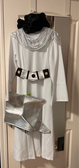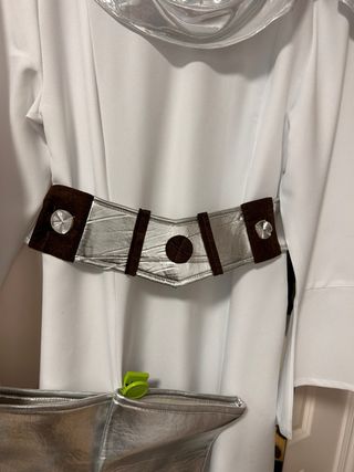 1 Disfraz inspirado en la Princesa Leia, 2 disfraces infantiles de Obi Wan Kenobi ideal para fiestas temáticas o eventos. - Vestido blanco largo con mangas acampanadas. - Capa plateada brillante. - Cinturón plateado con detalles marrones y circulares. - Botas plateadas. - Peluca negra con moños laterales.