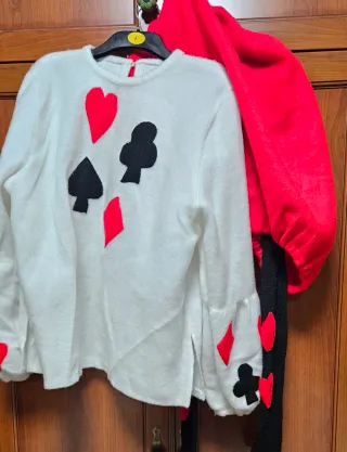 Disfraz con motivos de cartas de póker. - Diseño blanco con rombo rojo. - Corazón rojo. - Trébol negro.
