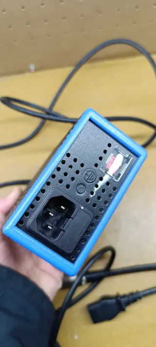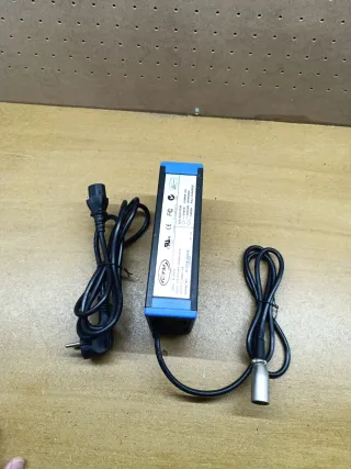 Cargador para silla de ruedas Invacare LEO. Incluye cable de alimentación y conector. - Diseño compacto y rectangular. - Carcasa de plástico azul y negro.