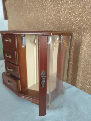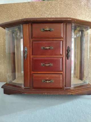 Elegante joyero de madera con varios compartimentos para organizar tus accesorios. - Diseño de madera con detalles ornamentales. - Múltiples cajones para almacenamiento. - Laterales de cristal para exhibir. - Tiradores metálicos decorativos.