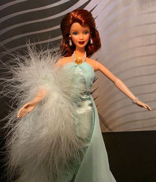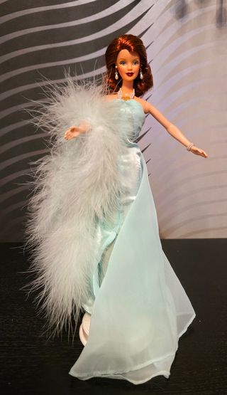 Muñeca Barbie Between Takes de edición coleccionista, inspirada en el glamour del cine. - Vestido largo de seda en tono menta. - Acompañada de un elegante chal de plumas. - Joyería detallada con perlas y detalles dorados. Siempre en vitrina. Se vende sin peana ni caja.