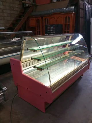 Vitrina refrigerada para pastelería de 2 metros de longitud. Ideal para exponer productos. 3 baldas interiores con frio en la parte inferior. 617113912 - Diseño curvo con cristal frontal. - Estantes interiores de cristal. - Base de color rosa.