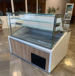 Vitrina expositora refrigerada, ideal para panaderías, pastelerías o tiendas de alimentación. - Diseño curvo y elegante. - Superficie de exposición de cristal. - Base de madera.