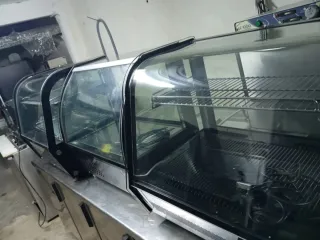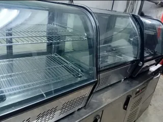 Vitrina refrigerada con superficie de cristal, ideal para exponer productos de pastelería. - Estructura de metal y cristal. - Diseño moderno y funcional.