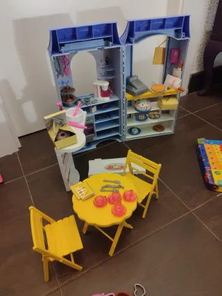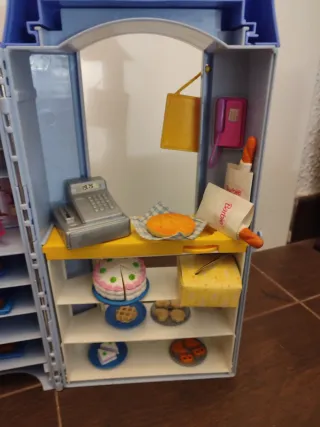 Set de pastelería para barbies, ideal para recrear un negocio. Se pliega cerrándose para guardar. - Incluye vitrinas, mostrador y mesas. - Accesorios de repostería y comida. - Diseño colorido y detallado.