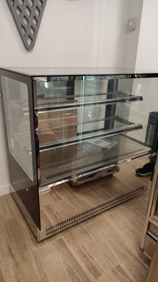Vitrina expositora Edenox Vera 900 para pastelería, muy poco uso. Ideal para negocios de repostería. Sólo recogida. No se hacen envíos. - Tres estantes de cristal. - Estructura de acero inoxidable. - Diseño moderno y elegante. - Medidas: 90x70cm