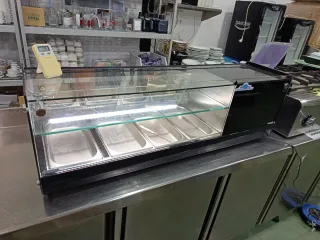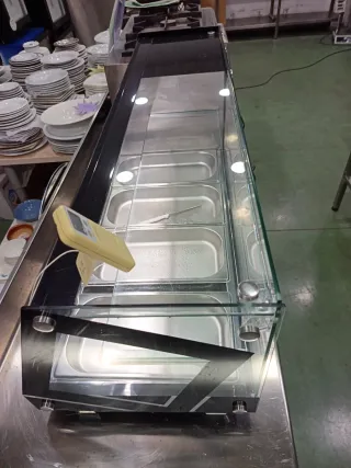 Vitrina de baño maría, ideal para servir tapas. Tiene solo dos meses de uso. - Construcción en acero inoxidable. - Diseño con cristal frontal.