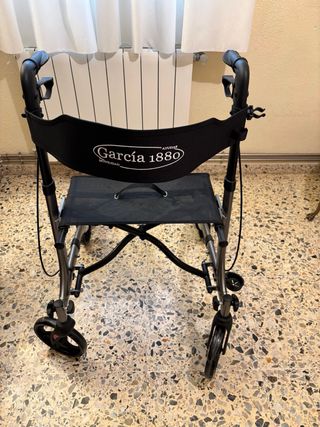 Andador de la marca Garcia 1880, modelo con asiento incorporado. - Estructura metálica. - Asiento de tela. - Ruedas delanteras giratorias. - Frenos en las empuñaduras.