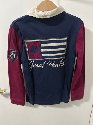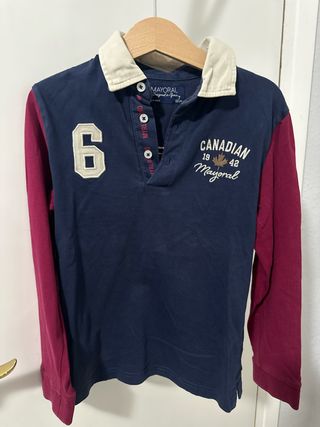 Camisa polo de manga larga para niño de la marca Mayoral. Combina azul marino con mangas en color granate y cuello blanco. - Detalle de número 6 bordado en la parte delantera. - Estampado Canadian 1942 Mayoral en la parte delantera. - Cierre de botones en el cuello.
