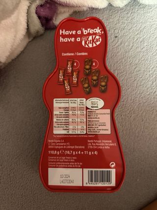 Caja metálica con diseño de conejo de Pascua de Kit Kat. - Diseño en forma de conejo. - Colores rojos y blancos. La caja va vacia por dentro