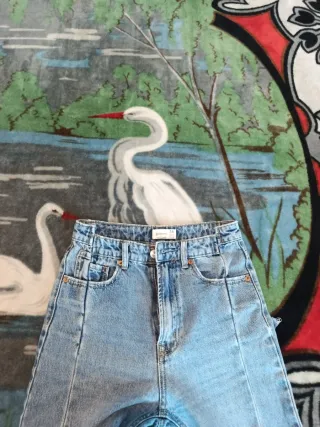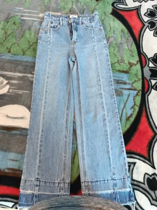 Vaqueros Stradivarius de corte ancho y estilo desgastado. - Tiro alto. - Bolsillos delanteros y traseros. - Bajo deshilachado. Usados pero están bien. Talla 36