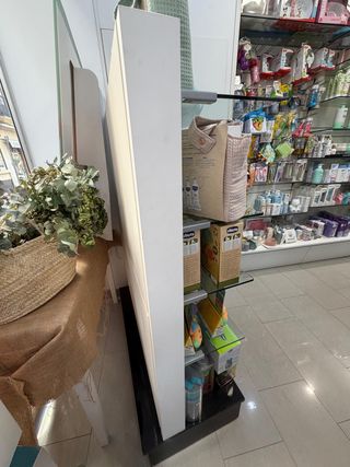 Gondola escaparate. Exposicion a 1 cara con 4 baldas de cristal 99x30cm Base rectangular con ruedas MEDIDAS 50(ancho)x108(largo)x145(alto)cm