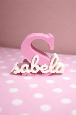 Preciosa letra S decorativa en color rosa, con el nombre 'Sabela' en blanco superpuesto. Ideal para habitaciones infantiles o como regalo. - Material: Pla. - Color: Rosa y blanco. - Diseño: Letra S con nombre caligráfico.