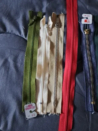 Lote de cremalleras de diferentes colores y tamaños. - Cremallera verde de 20 cm. - Cremallera beige. - Cremallera plateada. - Cremallera roja. - Cremallera azul marino de 16 cm. - Cremallera verde oscuro.