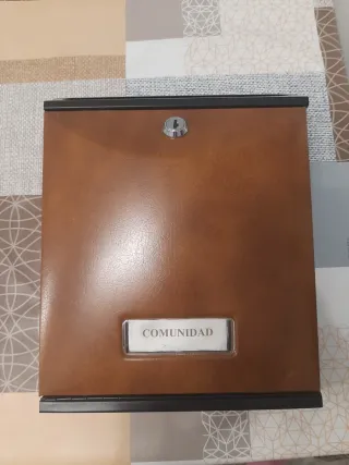 Buzón de madera con un diseño elegante y un acabado que imita la madera. Cuenta con una ranura superior para la correspondencia y una cerradura para mayor seguridad Tengo 8 unidades. - Acabado en color marrón. - Placa frontal con la palabra COMUNIDAD. - Incluye llave para la cerradura.