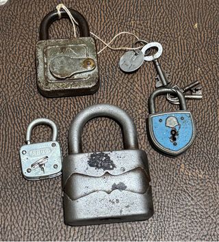 Cuatros candados de décadas pasadas, tres de ellos tienen llave, el grande no tiene llave.. el grande mide 13 cm de alto.