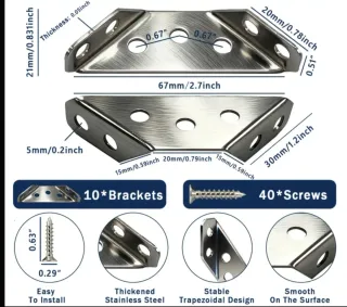 Kit de 10 soportes metálicos reforzados para reparación y montaje de muebles. Fabricados en acero inoxidable de alta resistencia con diseño triangular para mayor estabilidad. Incluye 40 tornillos autoperforantes para instalación rápida. ✔ Ideal para: reparar sillas reforzar mesas arreglar armarios estanterías cajones y muebles de madera ✔ Ángulo de 90° para máxima estabilidad ✔ Fácil instalación ✔ Producto nuevo 📦 Entrega en mano o envío por Wallapop.