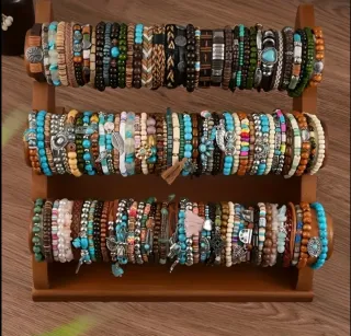 Conjunto de 50 pulseras con un diseño bohemio y artesanal. - Elaboradas con cuentas de madera y piedras turquesas. - Incluyen dijes metálicos con motivos de plumas y flores. - Estilo étnico y natural Si quieres menos mejoramos el precio.