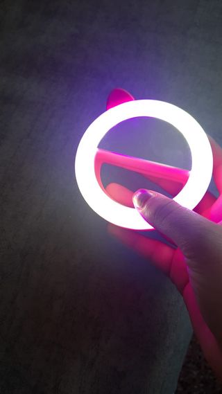 Espejo de mano con un aro de luz LED que cambia de color. - Aro de luz LED. - Colores vibrantes. - Diseño compacto.