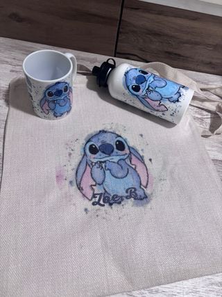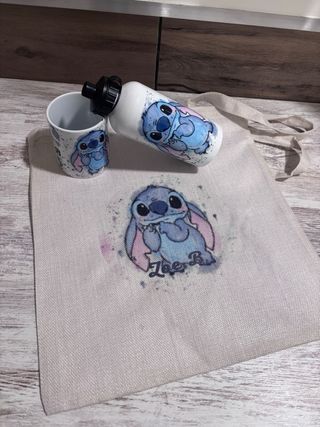 Conjunto de tres artículos con el personaje de Stitch. - Taza con diseño de Stitch. - Botella de agua con diseño de Stitch. - Bolsa de tela ( tote bag) con diseño de Stitch -se personaliza totalmente con el personaje que se quiera , con foto, texto, etc