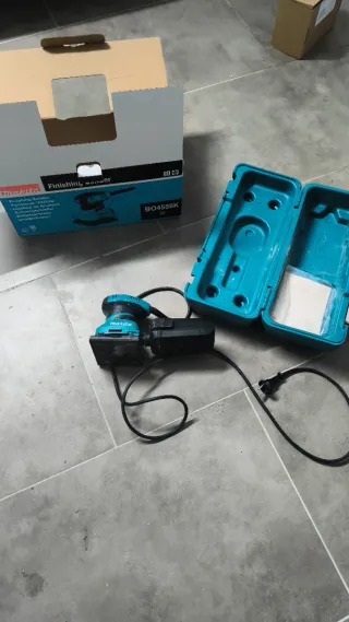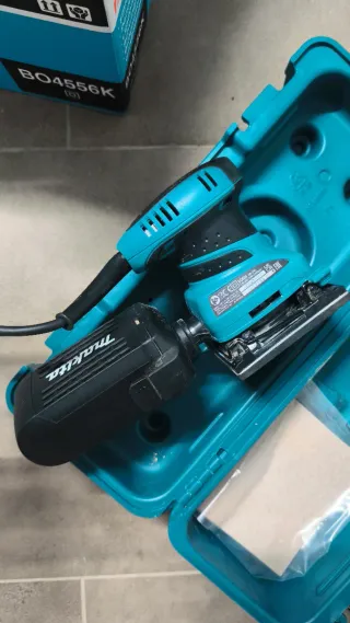 Lijadora orbital Makita en color azul y negro. Incluye su maletín de transporte. 1 uso - Modelo: BO4556K - Tipo: Lijadora orbital - Marca: Makita - Color: Azul y negro - Incluye maletín