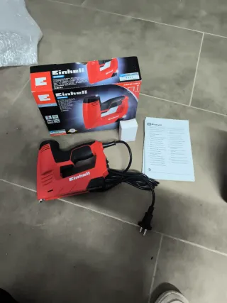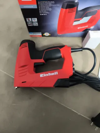 Pistola grapadora eléctrica de la marca Einhell, ideal para trabajos de bricolaje y manualidades. - Color rojo y negro. - Incluye manual de instrucciones.