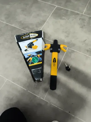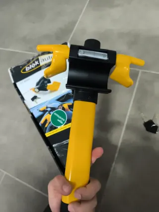 Bloqueo de volante Blok Auto en color amarillo y negro. Incluye dos llaves. - Diseño robusto para mayor seguridad. - Fácil de instalar y quitar.