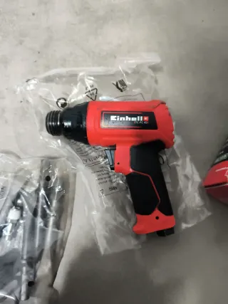 Cinceladora neumática Einhell en su caja original. - Incluye cinceladora, accesorios y manuales. - Color rojo y negro.