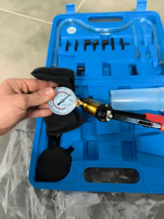 Kit de purga de frenos al vacío, diseñado para facilitar el cambio de líquido de frenos. - Maletín azul para almacenamiento y transporte. - Manguera transparente. - Adaptadores de diferentes tamaños. - Bomba de vacío manual. - Depósito para líquido.
