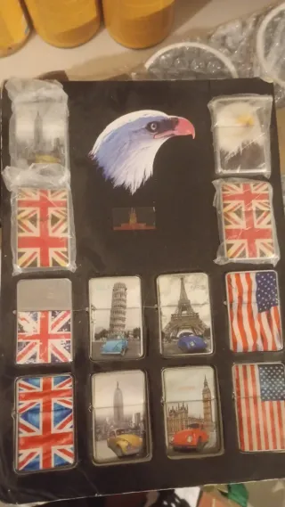 Conjunto de mecheros Zippo diseños variados para grabar con dremel. - Diseños de banderas (Union Jack, USA). - Monumentos icónicos (Torre Eiffel, Torre de Pisa, Empire State, Big Ben). - Ilustración de águila. - Incluye varios mecheros