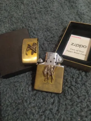 Se venden dos encendedores Zippo de la marca Marlboro. Ambos presentan un diseño grabado con motivos ecuestres. - Diseño de jinete en uno de los encendedores. - Diseño de caballo en el otro encendedor. - Acabado metálico en tono bronce.