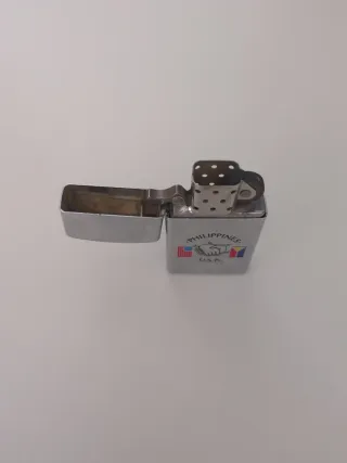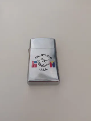 Mechero Zippo plateado de 1968 con un diseño que conmemora la relación entre Filipinas y Estados Unidos. Presenta un apretón de manos entre las banderas de ambos países. - Diseño: Filipinas - USA con apretón de manos. - Acabado: Plateado metálico. - Símbolo de unión entre dos naciones.