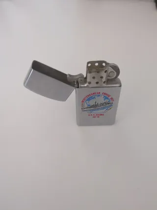 Mechero Zippo conmemorativo de la Mediterranean Cruise 1977 de la U.S.S. SIERRA AD-18 (fabricado en 1968) - Diseño metálico plateado. - Grabado del mapa del Mediterráneo y el barco.