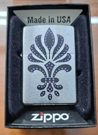 Encendedor Zippo con un diseño floral y puntos morados y zippo con dibujo rojo - Fabricado en EE. UU. - Diseño con motivo floral. - Detalles en color morado.