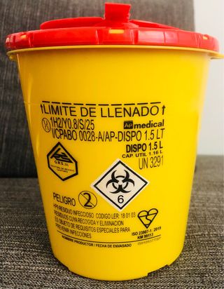 Contenedor amarillo para residuos punzantes, con tapa roja y capacidad de 1.5 litros. Ideal para desechos médicos y sanitarios. - Capacidad útil: 1.16 L. - Marcado UN 3291. - Símbolo de residuo infeccioso. - Cumple norma ISO 23907-1: 2019.