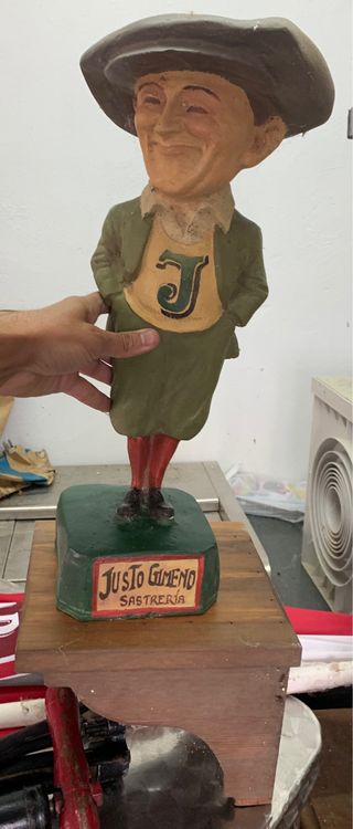 Figura decorativa para bares o bodegas. Realizada en barro y madera. La peana de abajo de madera va adosada a la figura.