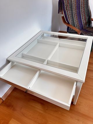 Preciosa mesita de centro para el salón, en color blanco. Está en muy buen estado. - Diseño elegante y moderno. - Incluye un cajón y compartimentos de almacenaje con tapa de cristal. - Estructura robusta y estable.