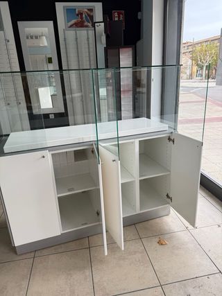 Escaparates de madera blanca y cristal, con ruedas para moverlos fácilmente y madera de alta calidad fabricados por ebanista, ideal para tiendas de óptica o negocios similares. Su diseño moderno y elegante aportará un toque profesional a tu establecimiento, prácticamente nuevos Un escaparate Estructura de cristal cerrada, 1,35 anchox 0,80alto+0,50 cristal metros - Base gris. - Puertas de almacenamiento con baldas El otro escaparate mas pequeño y abierto por la zona superior del cristal 1,20x 0,95 alto+0,50 altura del cristal, la base se desliza para poder poner el producto a exponer, sin tener que mover el mueble, con almacenaje