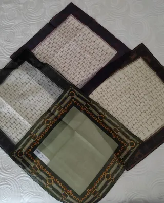 Conjunto de cuatro pañuelos de la marca PIERRE BACCARA. - Diseño con motivos de eslabones y cadenas. - Colores variados: blanco, negro, verde y burdeos. - Acabados de calidad. Orillo hecho a mano!