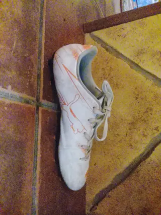 Zapatillas de fútbol Puma en talla 38. Diseñadas para el juego en césped. - Combinación de colores blanco y naranja. - Cierre con cordones.