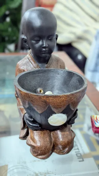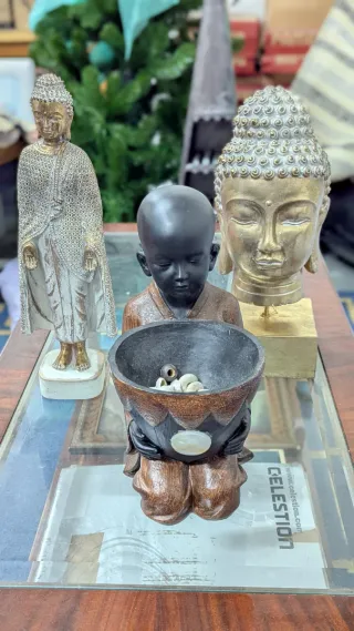 Conjunto de figuras decorativas de Budas. - Buda de pie con túnica detallada. - Cabeza de Buda dorada. - Figura de monje con cuenco. 25€ cada uno 60€ los 3