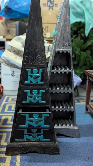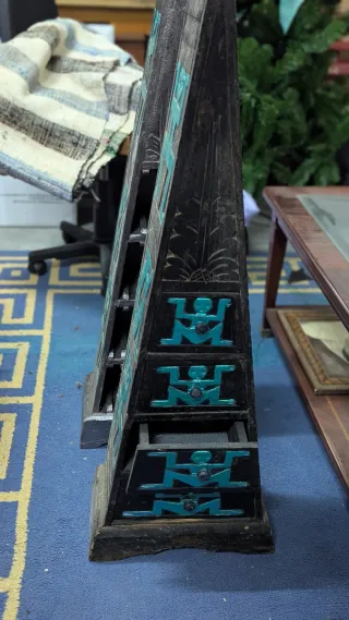 Original cajonera con forma piramidal, ideal para añadir un toque único a tu hogar. Presenta un diseño con figuras decorativas en color turquesa. - Estructura de madera. - Acabado en negro y turquesa. - Diseño con tres cajones